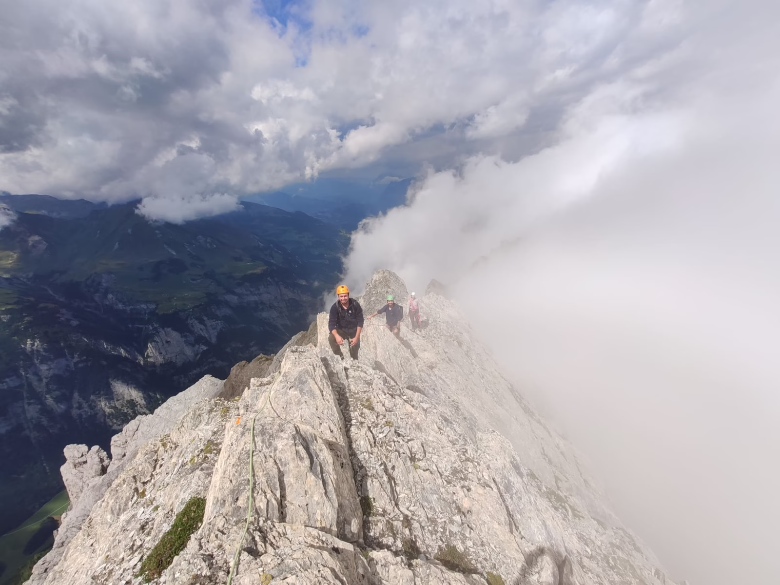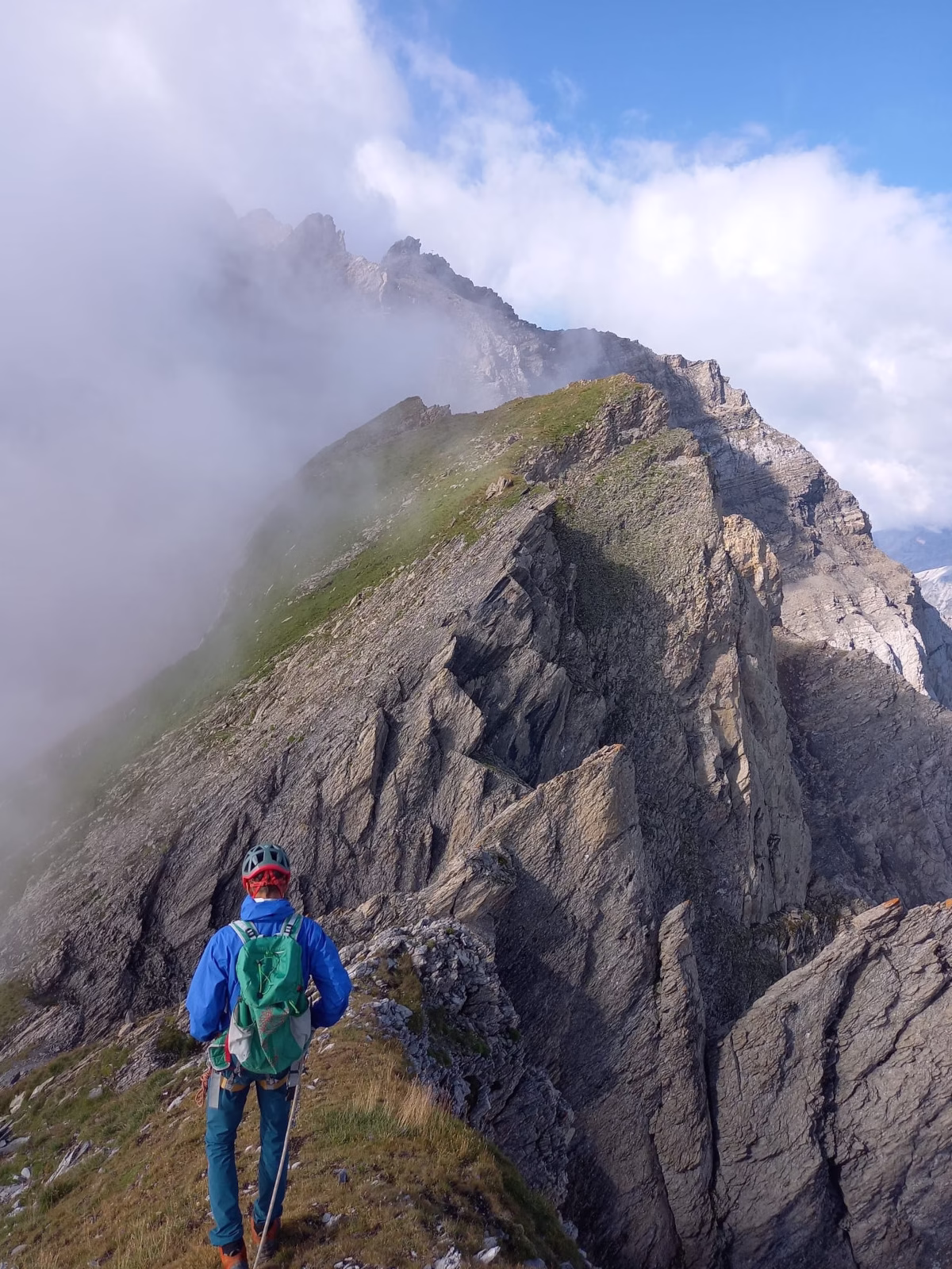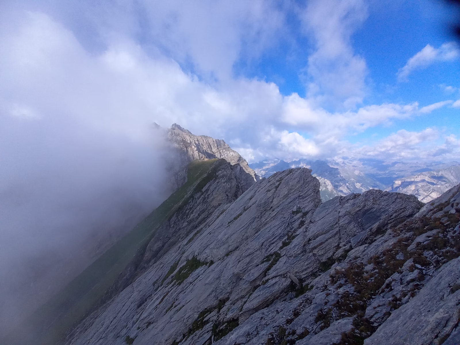 Gemeinsam fahren wir mit dem Auto bis zur Vazer Alp. Von da geht die abwechslungsreiche Wander- und Kletterei los. Zuerst über die steile Wiese weglos in etwas mehr als einer Stunde auf den Berger Calanda dann dem Grat entlang auf den Rossfallenspitz. Mit mehreren kurzen Auf- und Abstigen gelangen wir meist dem Grat entlang auf den Napoleon. Der Napoleon ist in der Landeskarte nicht eingetragen, seine Höhe beträgt aber etwa 2730m. Wir seilen kurz ab und dann geht es wieder kletternd aufwärts in die Lücke (Lugga) und weiter zur Taminflanke. Jetzt wird das Gelände wieder einfacher und so erreichen wir bald den Haldensteiner Calanda (2806m).