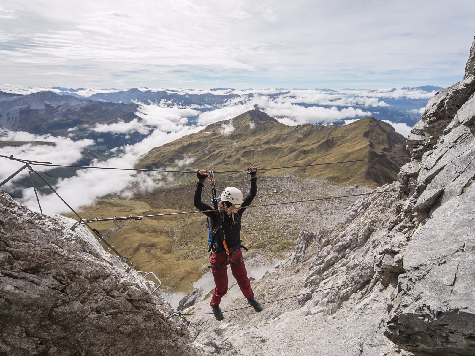 Nach circa 1.5 Stunden wandern erreichern wir den Einstieg des Klettersteigs. Im unteren Teil erwartet uns gestufter Fels mit mehreren kürzeren Steilpassagen. Fast zu Beginn der Route befindet sich die Einstiegsleiter zur Überwindung der «Einstiegswand». Weiter geht’s zum «Obelixquergang» und hinauf zum Beginn der Rampe. Ab hier gibt’s keine Ausstiegsmöglichkeit mehr! Nach Durchsteigung der «Rampe» erreicht man den «Geissrücken» und schliesslich das «Bänkli». Hier ist Zeit für eine kleine PAuse, denn wir haben die Routenmitte erreicht. Dann folgt eine längere Querung über ein Grasband, bevor mit dem Einstieg in die «Panoramica» der zweite, steilere Teil beginnt. Besonders eindrücklich sind die Quergänge in den fast senkrechten Plattenschüssen mit faszinierenden Tiefblicken. Die Überquerung des «Deichmann-Steges» fordert zum Balanceakt. Nach dem Eintrag in’s Wandbuch geht’s über einen kleinen Aufschwung weiter, bis schliesslich der Einstieg zur «Klagemauer» erreicht wird. Dieser körperlich anstrengenste Routenteil führt zu einer kurzen «Brücke», die den Begeher in die «Gipfelwand» einweist. Nun haben wir es geschafft! Weiter geht es in wenigen Minuten zum Gipfelkreuz der Sulzfluh auf 2817 m.ü.M. Herrliche Rundsicht erwartet uns hier.