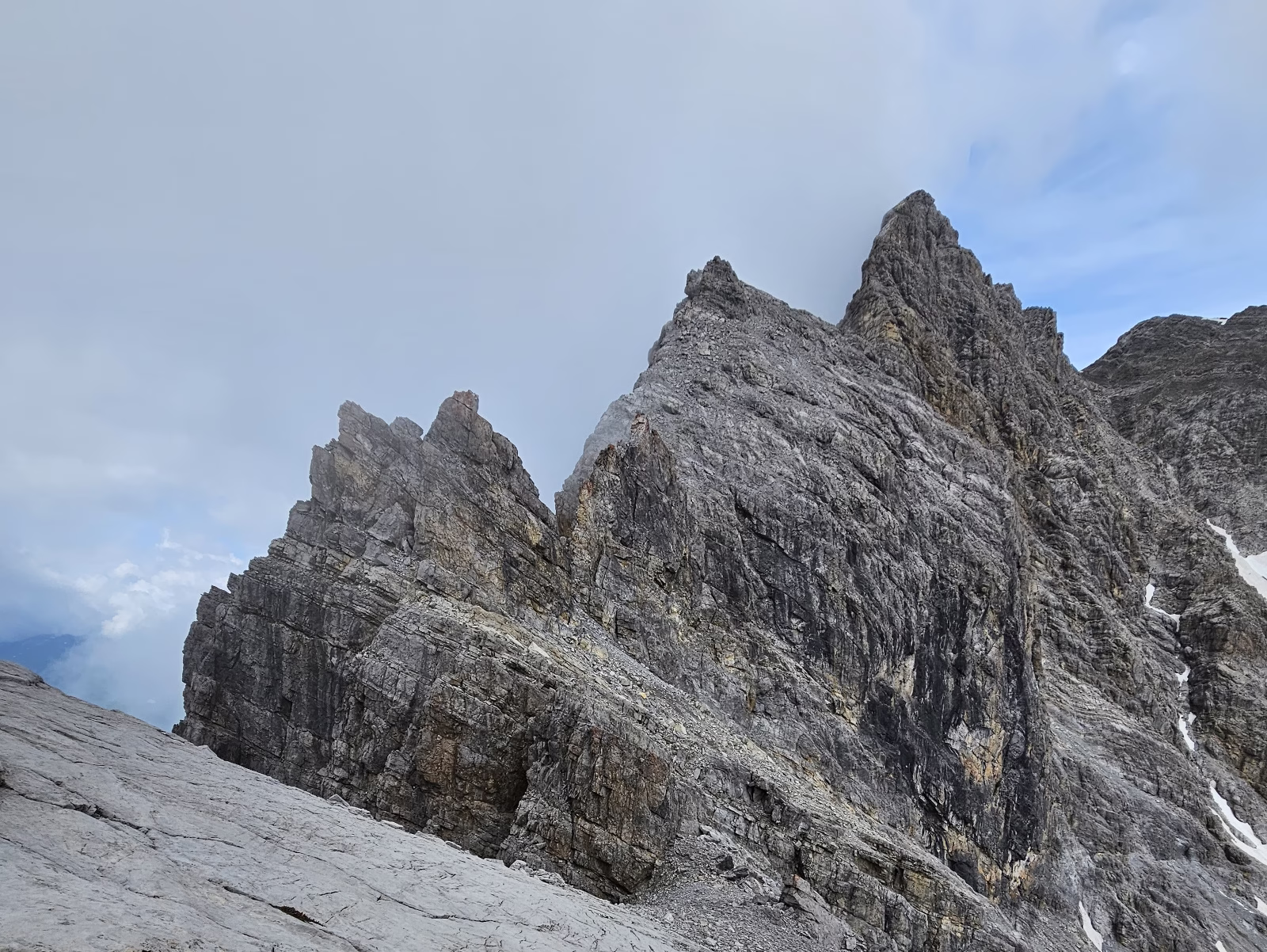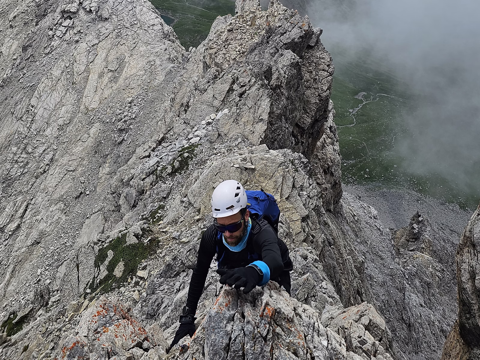 Wir seilen uns an und klettern über den Südostgrat, mal um einen Turm herum, mal über einen Turm hinauf weiter bis zum Gipfel des Piz Mitgel. Der Grat bietet abwechslungsreiche Kletterei mit teils scharfem Fels.