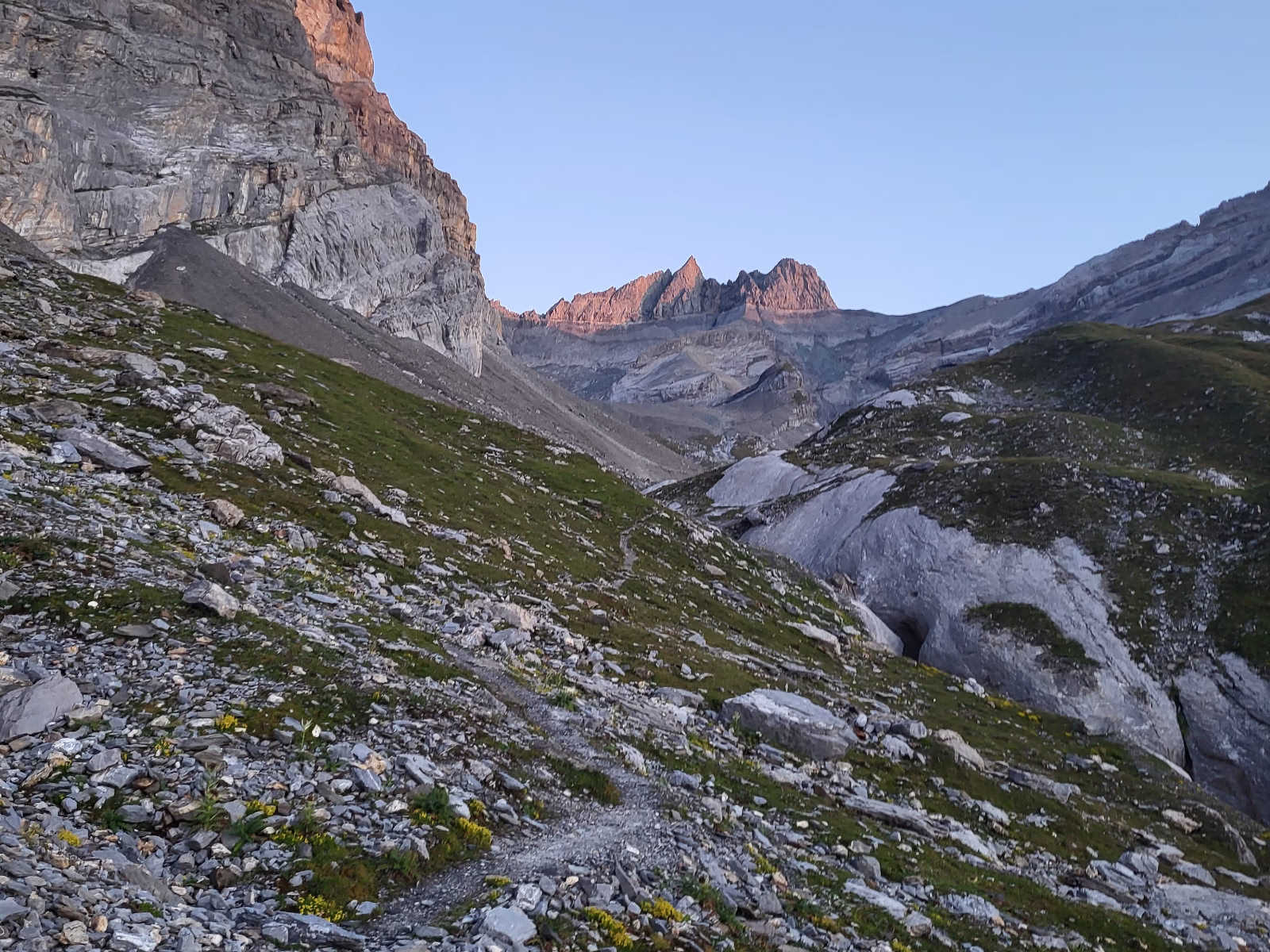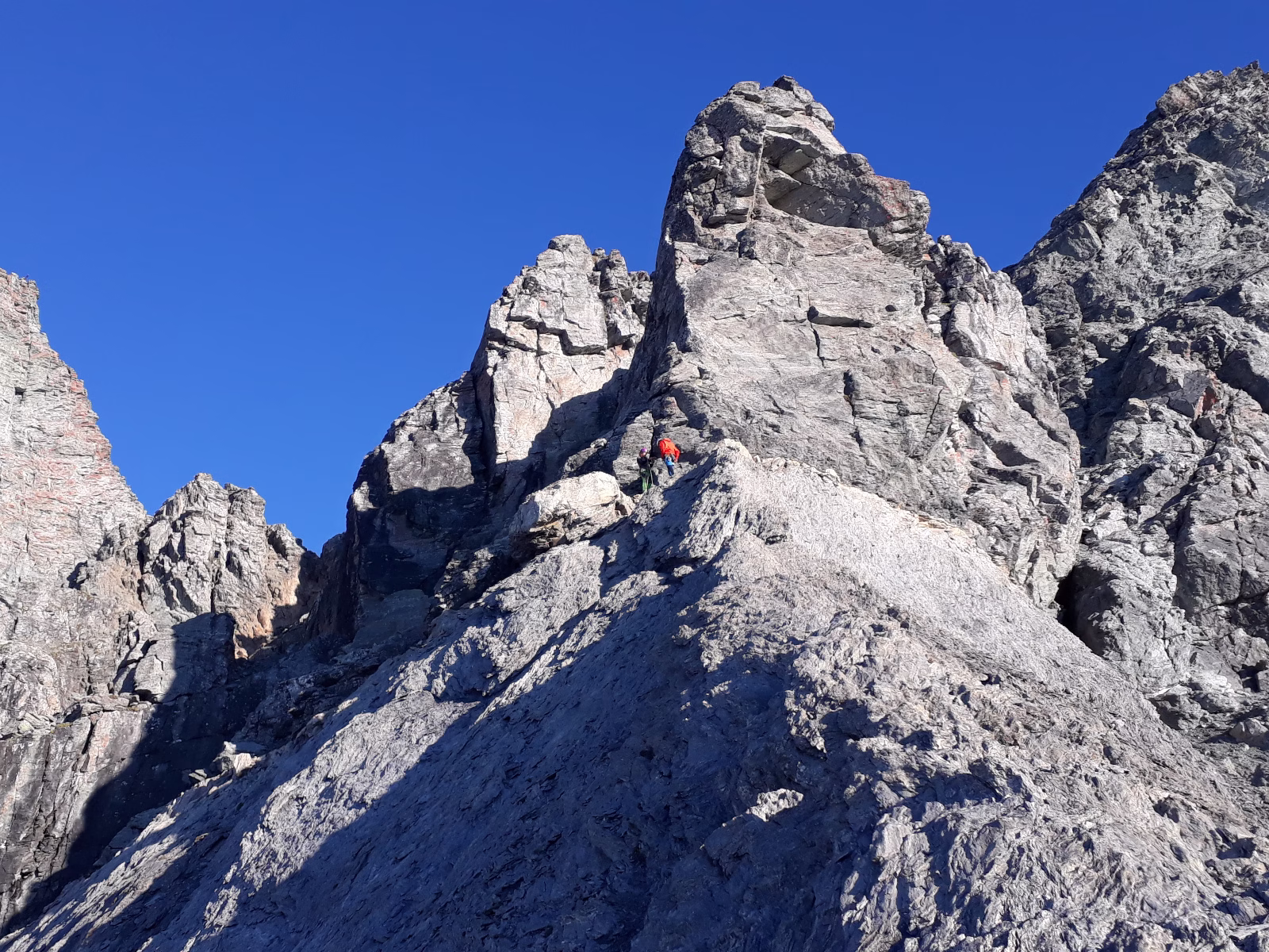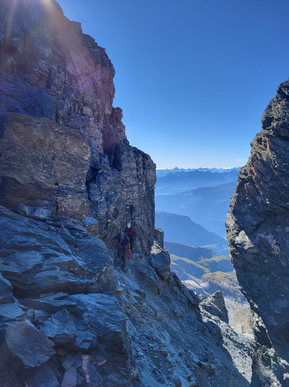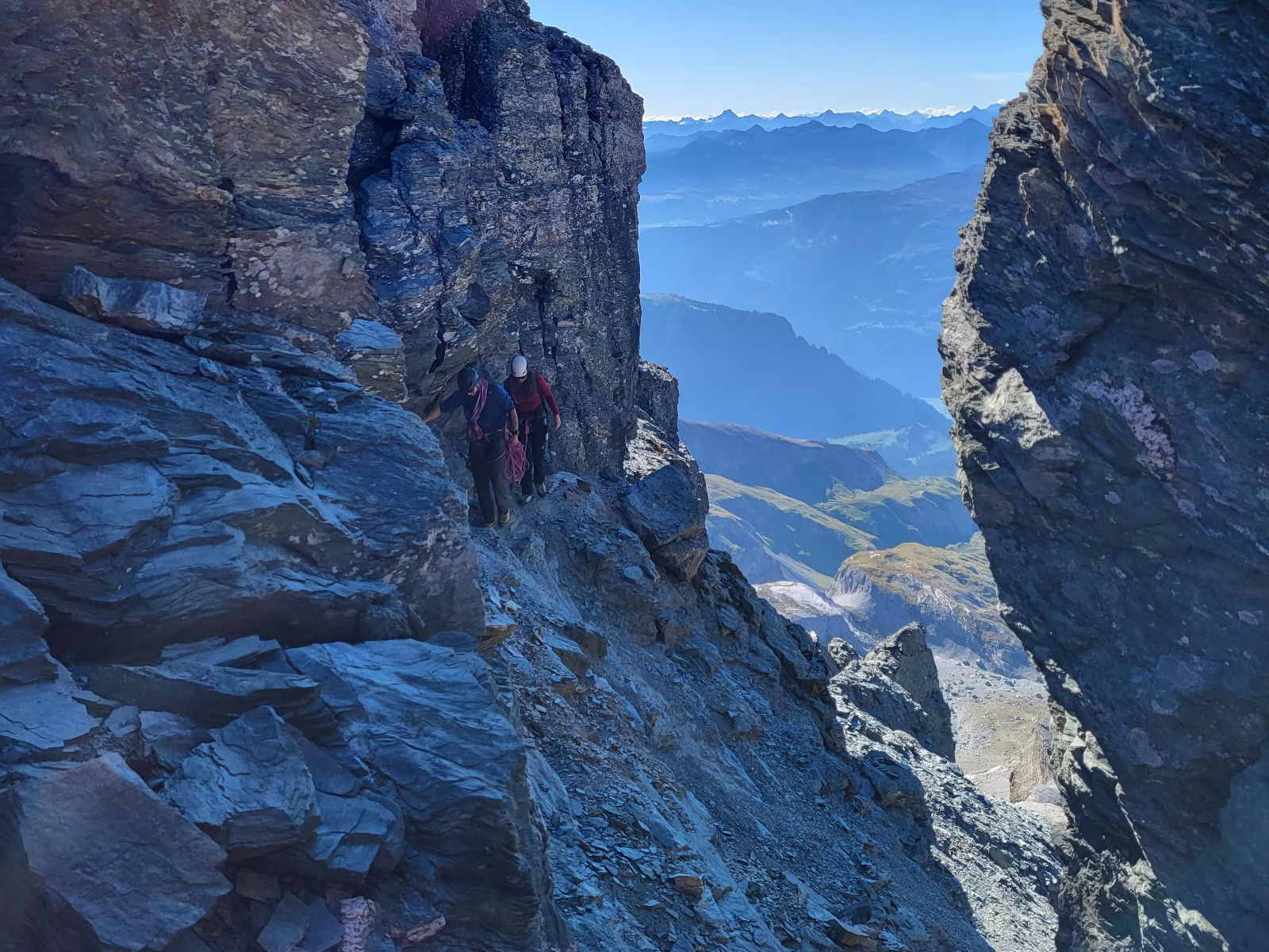 Nach dem Abseilen vom Gipfelturm folgen wir dem Abstieg über den «Morkopf» zur Ringelspitzhütte und auf dem Wanderweg zurück zum Auto am Kunkelspass. Der Abstieg nimmt circa drei Stunden in Anspruch.8h